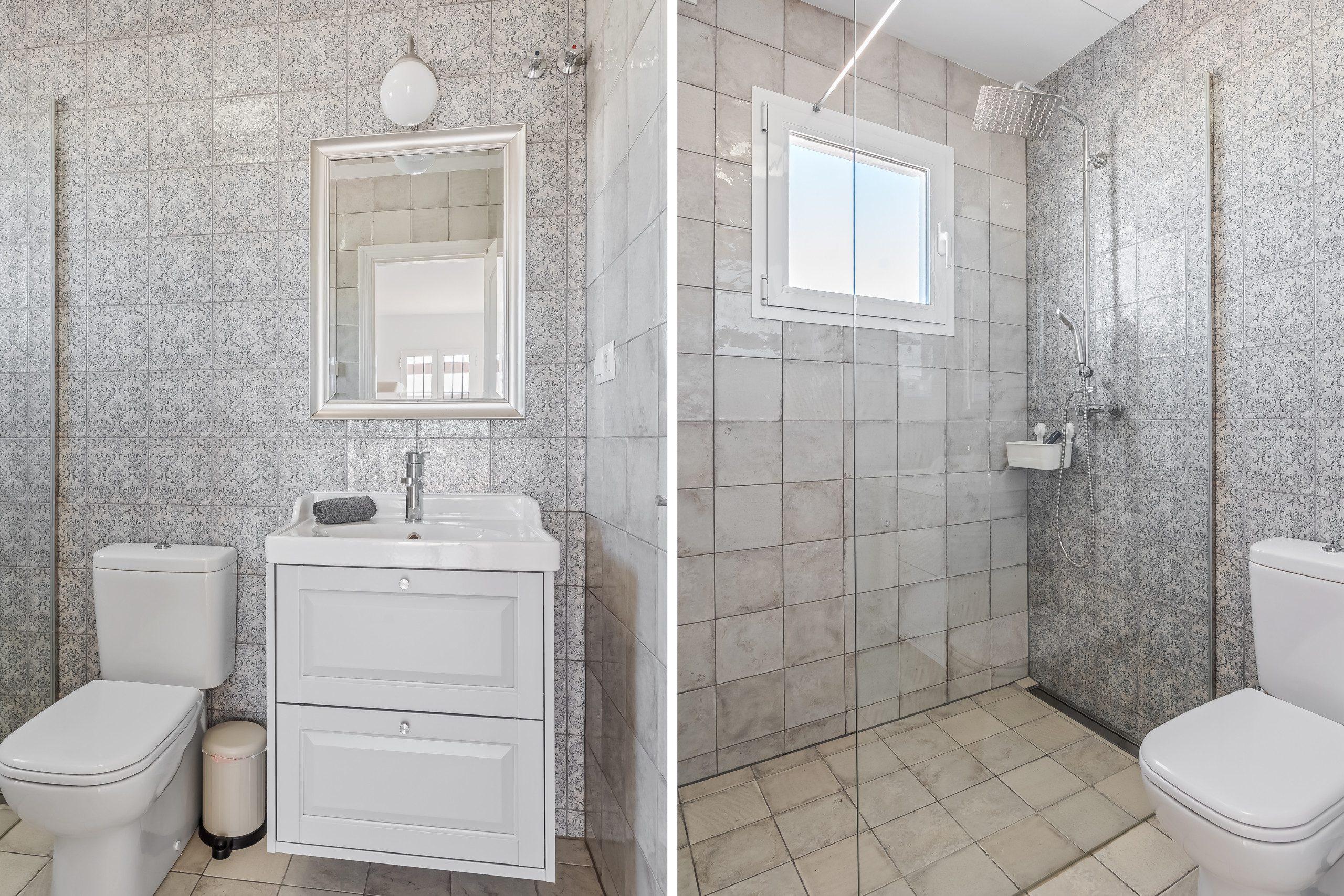 Die Unterkunft bietet drei komfortable Schlafzimmer, zwei Badezimmer mit Duschen sowie ein Gäste-WC. Das geräumige Wohnzimmer führt zu zwei der Terrassen – eine davon ist ein großer Innenhof mit Grillmöglichkeit, Essbereich, Lounge-Möbeln und Sonnenliegen.