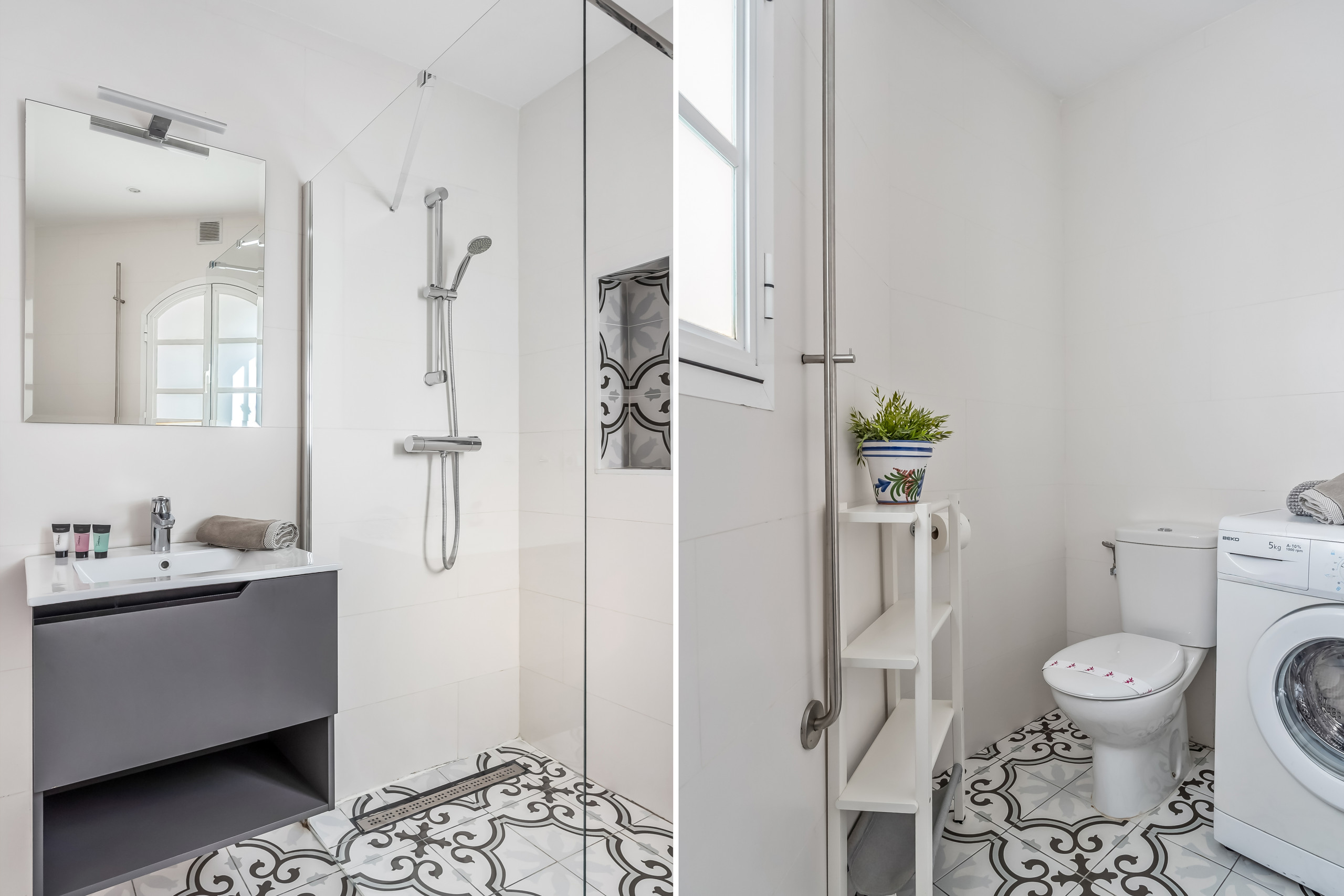 Die Wohnung verfügt über zwei große Schlafzimmer mit Doppelbetten und eingebauten Kleiderschränken, beide mit Zugang zur Terrasse. Ein Badezimmer ist mit einer Dusche und einer Waschmaschine ausgestattet, während das andere ein geräumiges Gäste-WC mit angrenzender Abstellfläche ist.