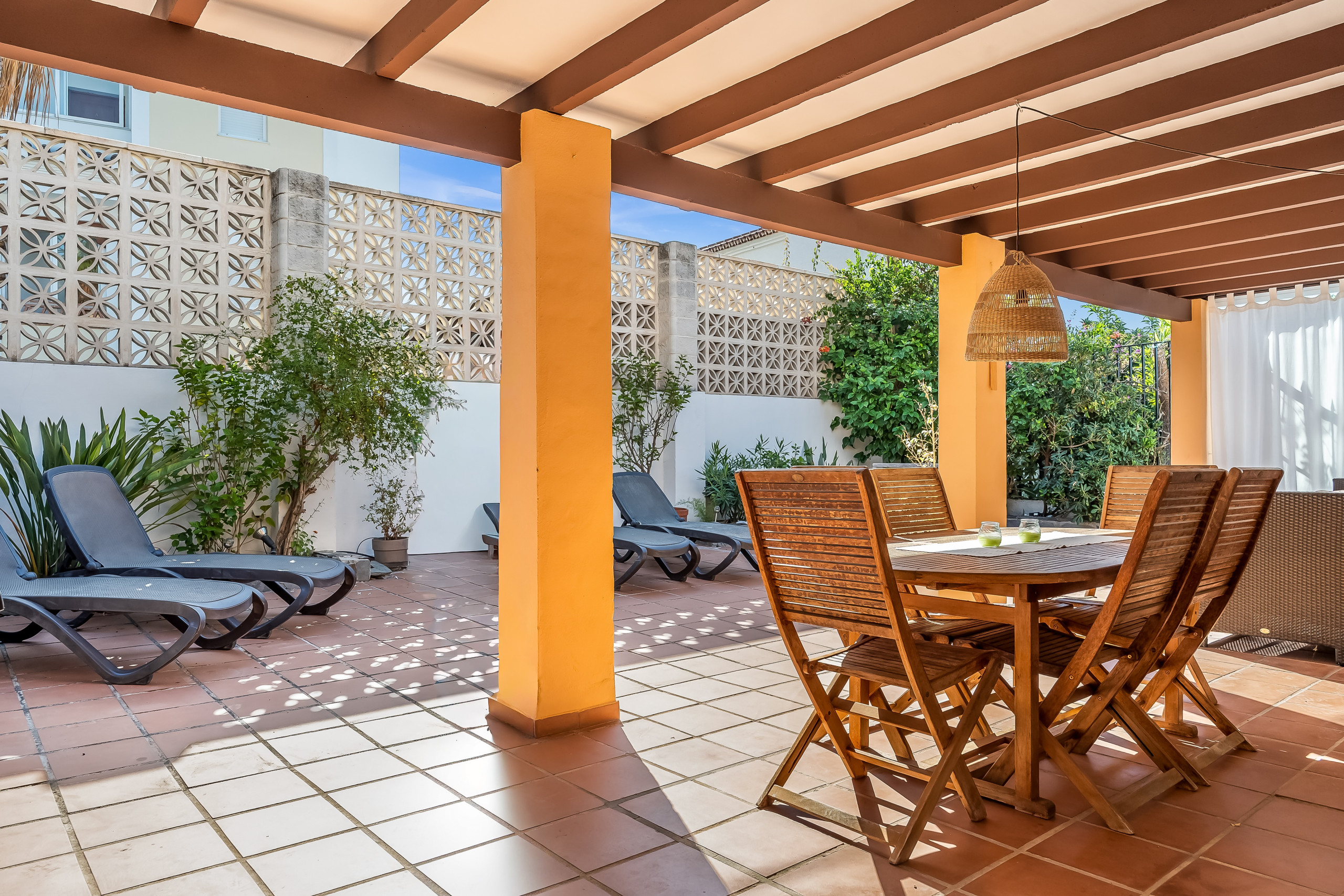 Sube una planta más y descubre la impresionante terraza en la azotea, que ofrece mucho espacio para relajarte tanto al sol como bajo la sombra de la elegante pérgola.