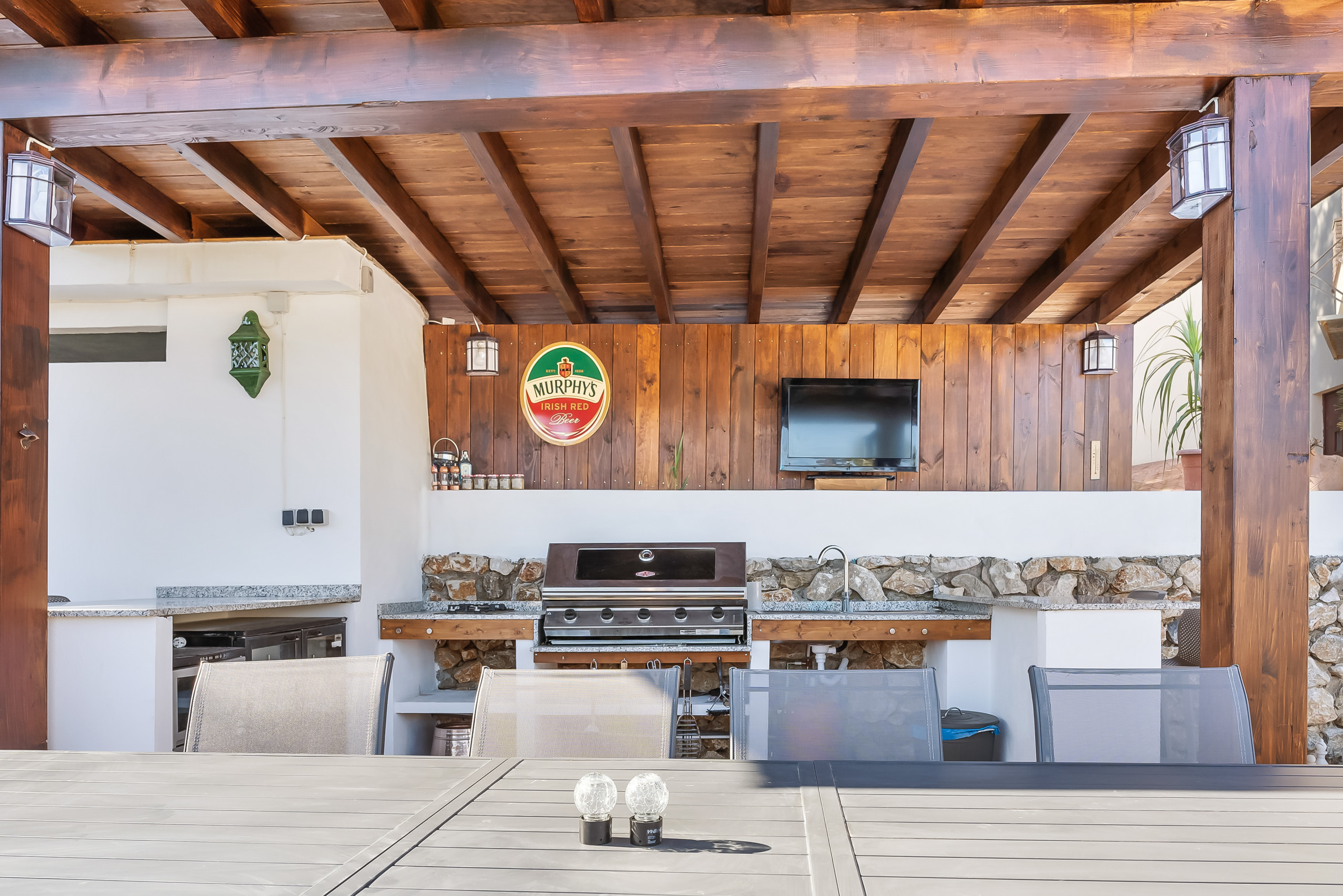 Next to the pool is a dining table and a spacious outdoor kitchen with a grill, hob and sink, perfect for long, delightful dinners under the open sky.